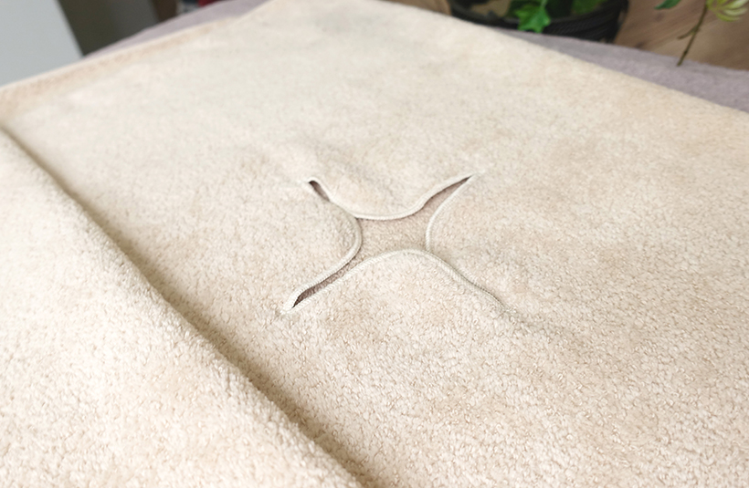 一般的なバスタオルサイズ。デコルテ・フェイシャル用に部分部分のタオル交換で洗い物が小さく・少量で済みます。