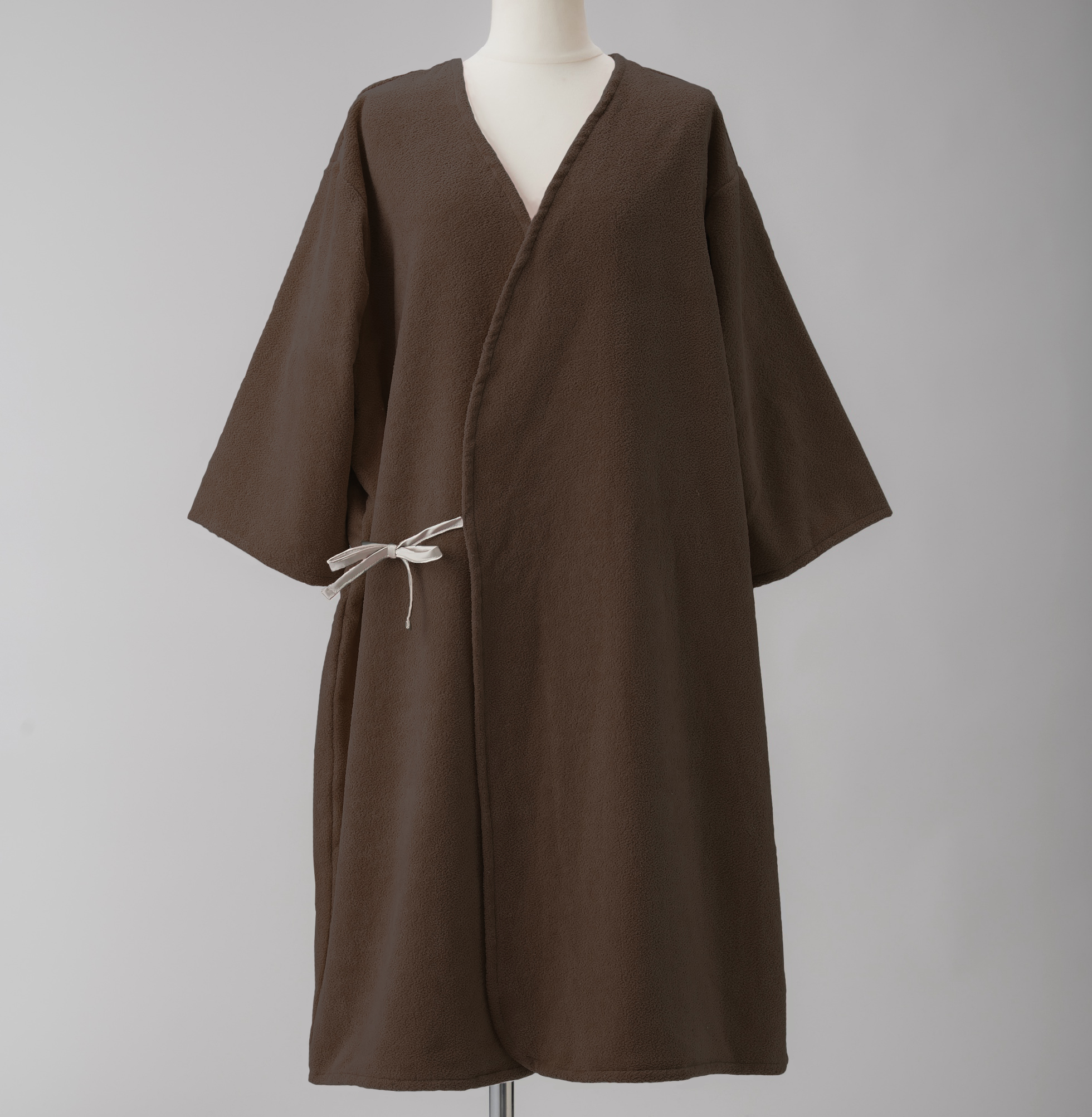 バスローブの大きな襟を無くし、ウエストのヒモも無くし、 シンプルなウェアにしました。肩の部分の縫製がラグランになっていますので、大きな方も小さな方もこの一着で使用できます。
